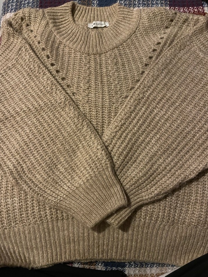 Bej renkli, yuvarlak yaka ve uzun kollu, rahat kesim normal uzunlukta örme kadın kazak.