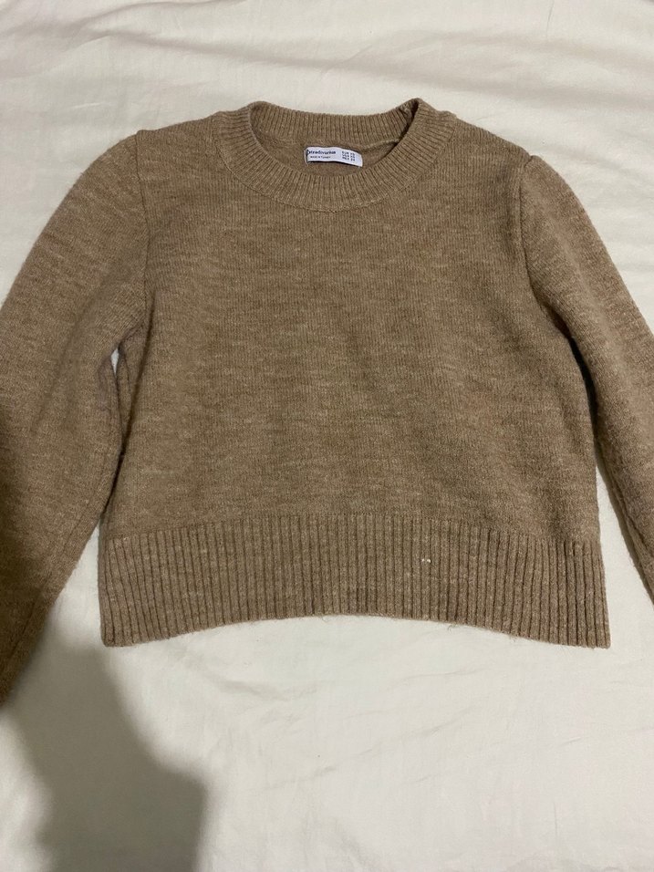 Bej renkli, yuvarlak yaka ve uzun kollu, örgü dokulu, rahat kesim ve normal uzunlukta triko kazak. Günlük kullanım için uygundur.
