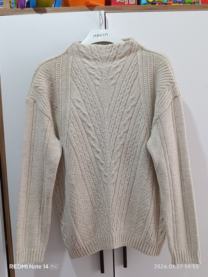 Bej renkli, uzun kollu, yuvarlak yakalı kadın triko kazak. Rahat kesimi ve örme kumaşıyla günlük kullanıma uygundur.