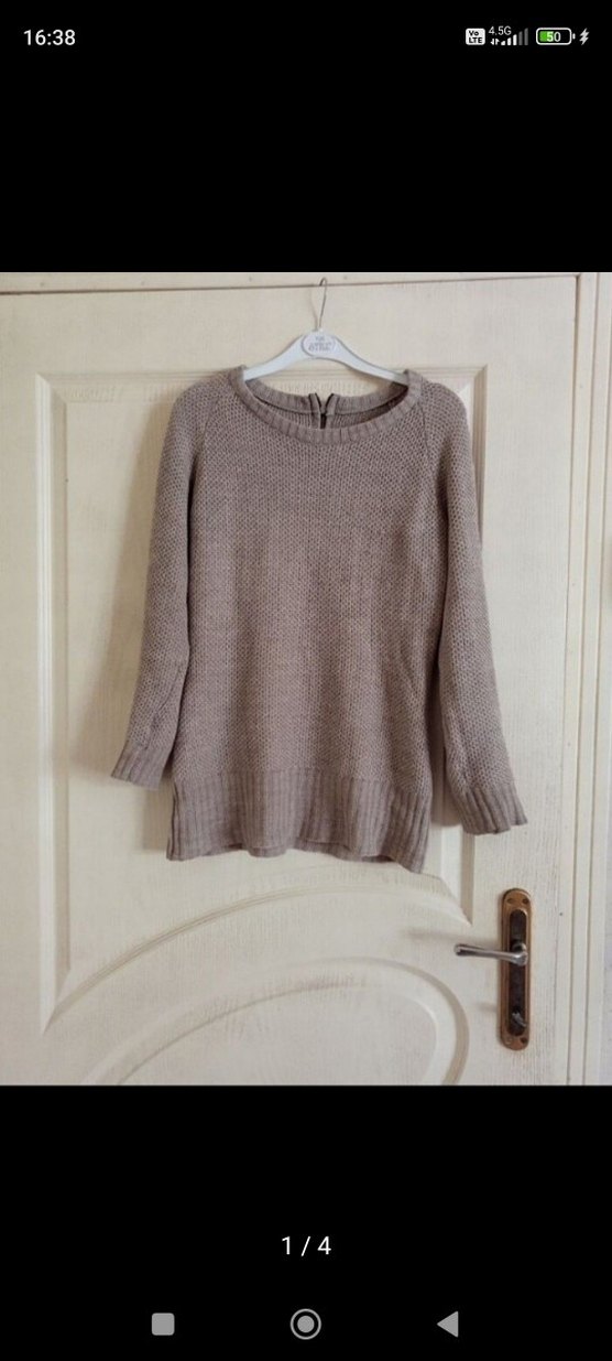 Bej renkte, yuvarlak yakalı ve uzun kollu kadın triko kazak. Rahat kesimi ve midi boyuyla gündelik kullanıma uygun, örgü dokulu ve konforlu.