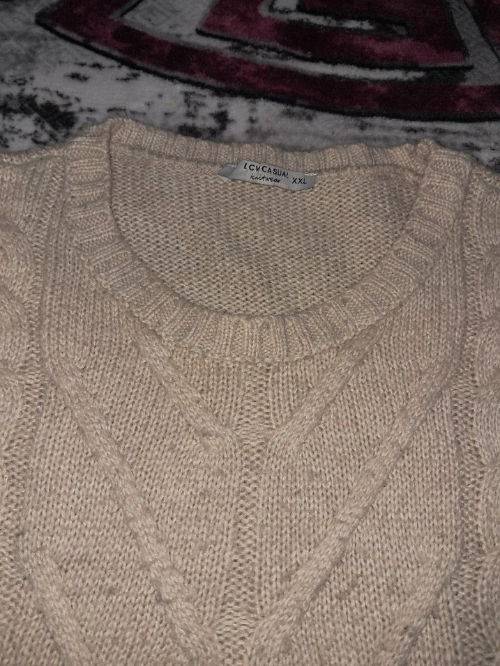 Bej renkli, uzun kollu, yuvarlak yaka ve bol kesim triko kadın kazak, rahat ve günlük kullanım için uygundur tüylenmeler mevcut fiyata yansıttım