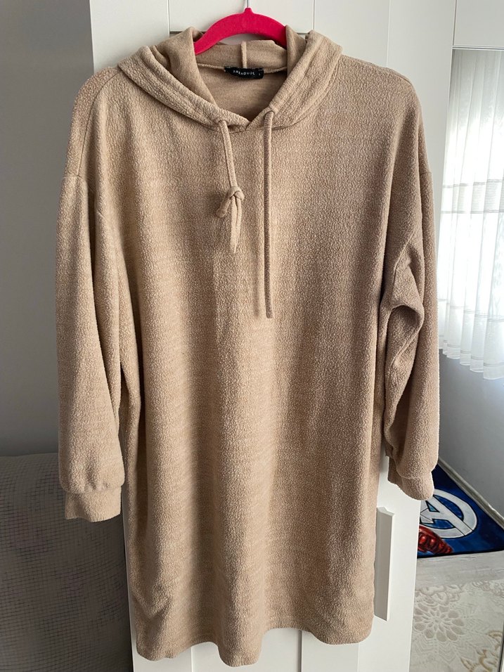 Bej renk, uzun kollu ve kapüşonlu triko midi elbise. Yumuşak keten kumaştan, rahat ve günlük kullanım için uygun.