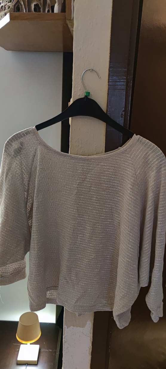 Bej renkli, yuvarlak yakalı ve uzun kollu kadın triko kazak. Keten kumaştan örülmüş, salaş kesim ve normal boyda, günlük rahat kullanıma uygundur. Standart beden.