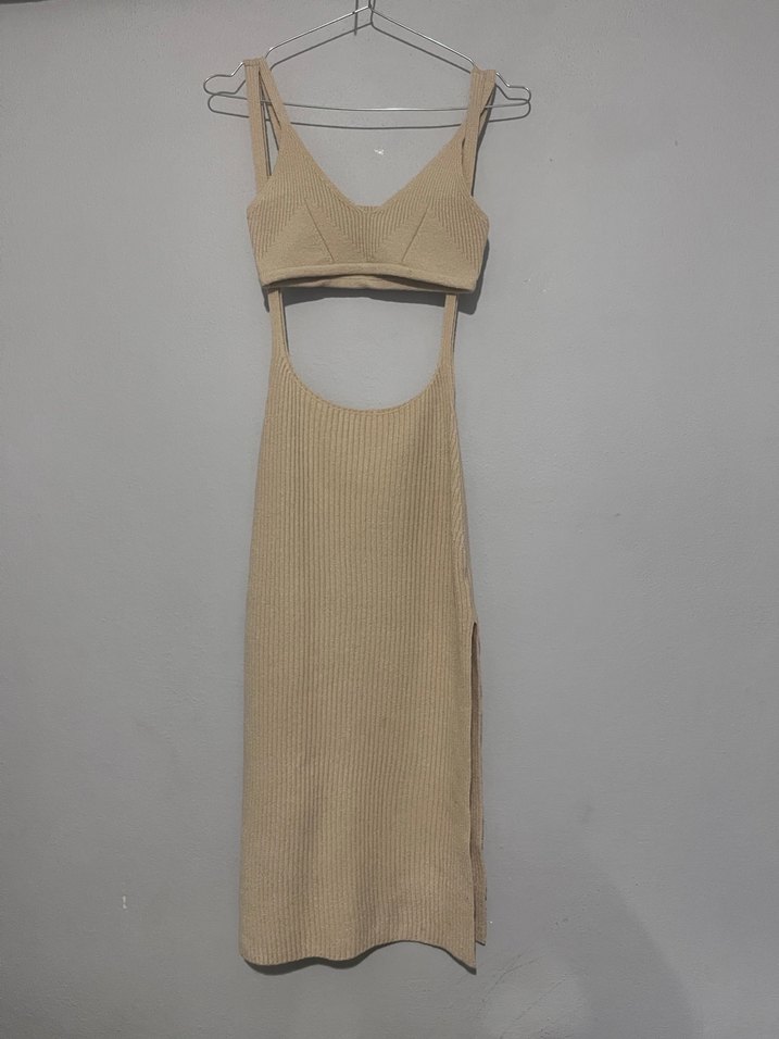 Bej renkli, askılı ve straplez triko uzun elbise, vücuda oturan kesimiyle minimal ve günlük sokak modasına uygun. Plaj elbisesi