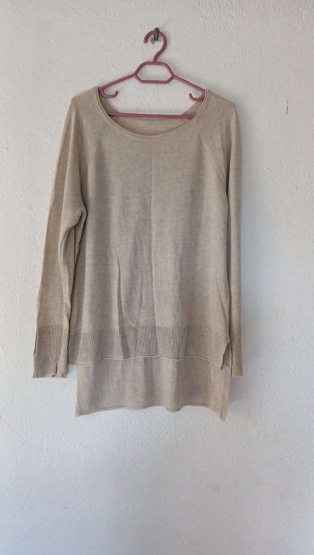 Bej renkli, uzun kollu, yuvarlak yakalı kadın kazak. Rahat kesim, normal midi boyda, yumuşak keten kumaştan örülmüş, gündelik kullanıma uygun sade ve desensiz model.