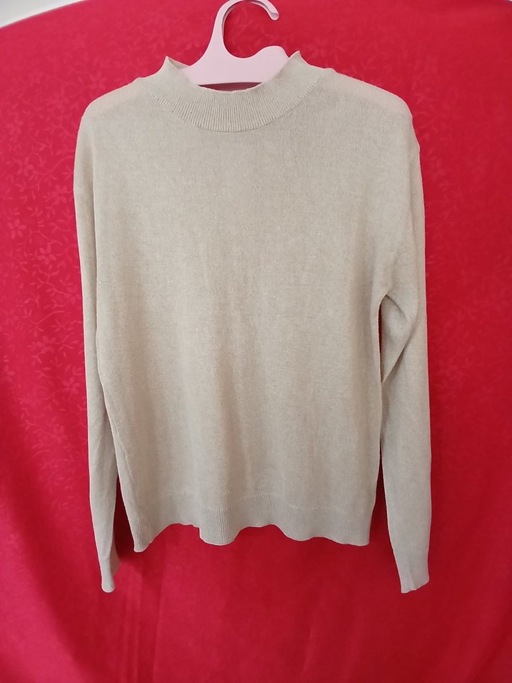 Bej renkte, bisiklet yaka ve uzun kollu, yumuşak keten kumaştan örülmüş kadın kazak. Rahat kesimi ve normal boyu ile günlük kullanıma uygundur.