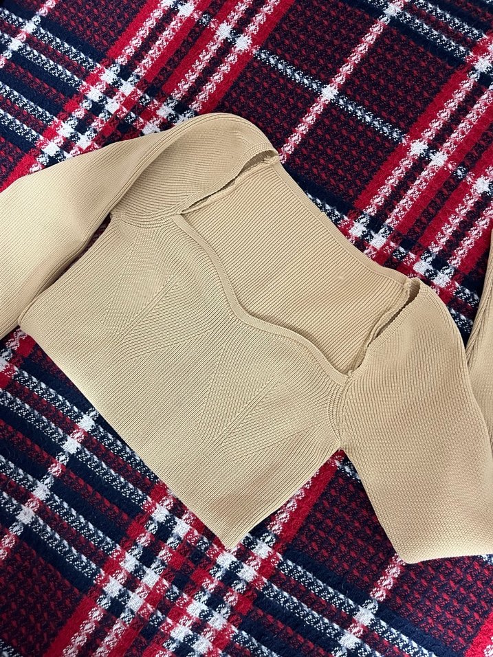 Bej renkli, uzun kollu, dar kesim kadın triko bluz. Yumuşak sentetik örgü kumaştan, günlük sokak stiline uygun.