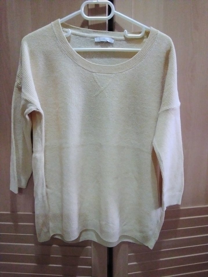 Bej renkli yün kazak, yuvarlak yaka ve uzun kollu tasarımıyla rahat ve sade bir görünüm sunar. Günlük kullanıma uygundur. 38 40 uyumludur açık sarı renk
