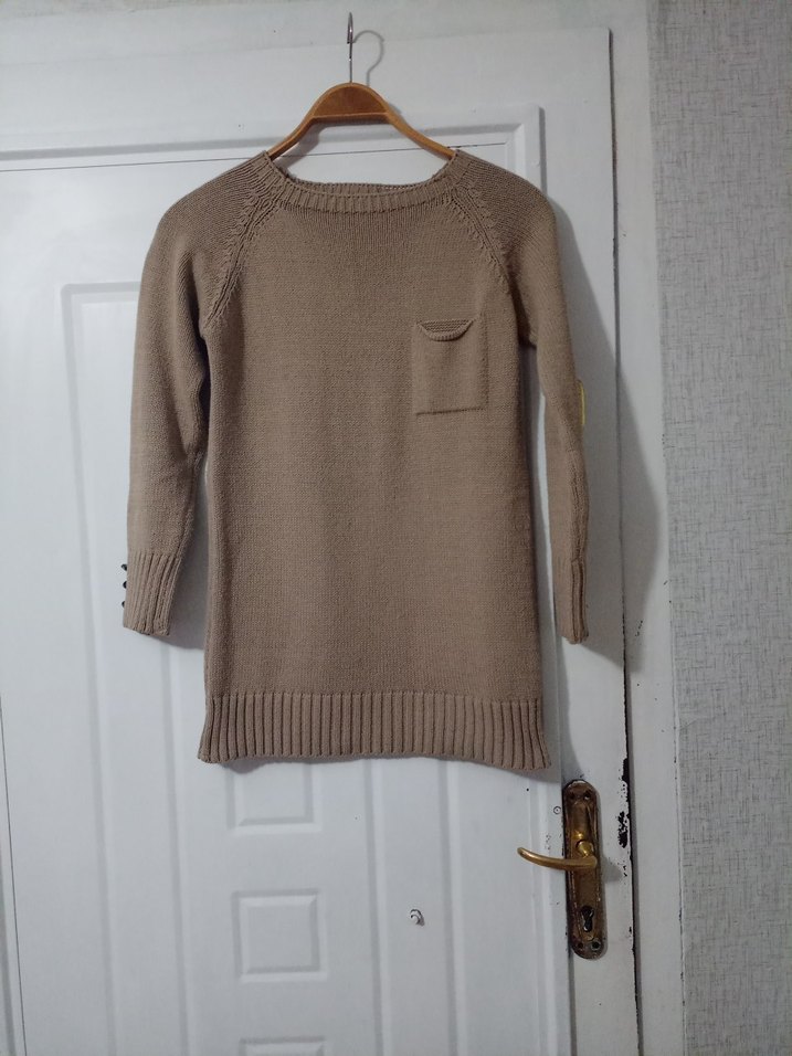 Bej renkli, bisiklet yaka ve uzun kollu örme kazak. Rahat kesimli ve küçük göğüs cebi bulunur, günlük kullanım için uygundur.