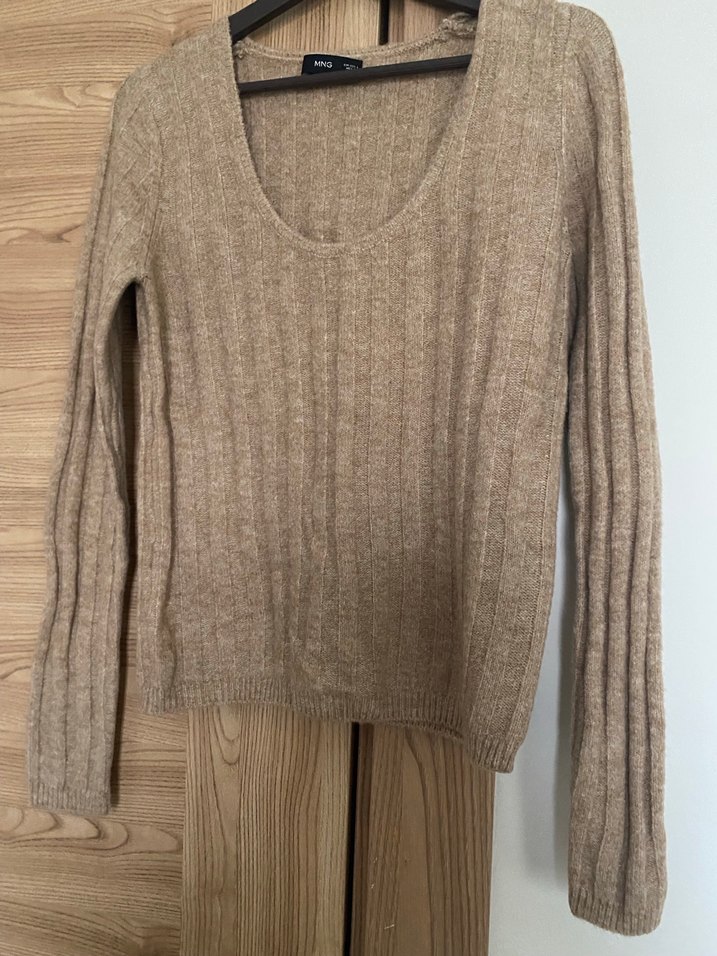 Hiç giyilmedi. Bej renkli, uzun kollu, yuvarlak yakalı kadın triko kazak. Rahat ve bol kesim, günlük kullanıma uygun yumuşak dokulu örme kumaş.