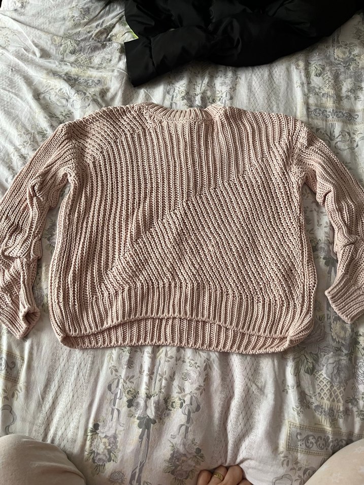 Bej renkli, örgü dokulu, uzun kollu ve yuvarlak yaka kadın kazak. Rahat kesimi ve pastel tonu ile günlük sokak stiline uygundur.