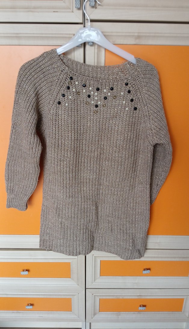 Bej renkli, triko dokuma, yuvarlak yaka ve uzun kollu, bol kesim günlük kullanıma uygun midi uzunlukta kazak. Yaka kısmında küçük boncuk detayları bulunur.