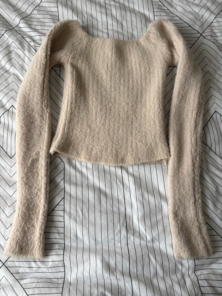Bej renkte, yumoş kumaştan, uzun kollu, v yaka, normal midi boyda, sade ve dar kesim kadın kazak. Rahat ve sıcak tutar.