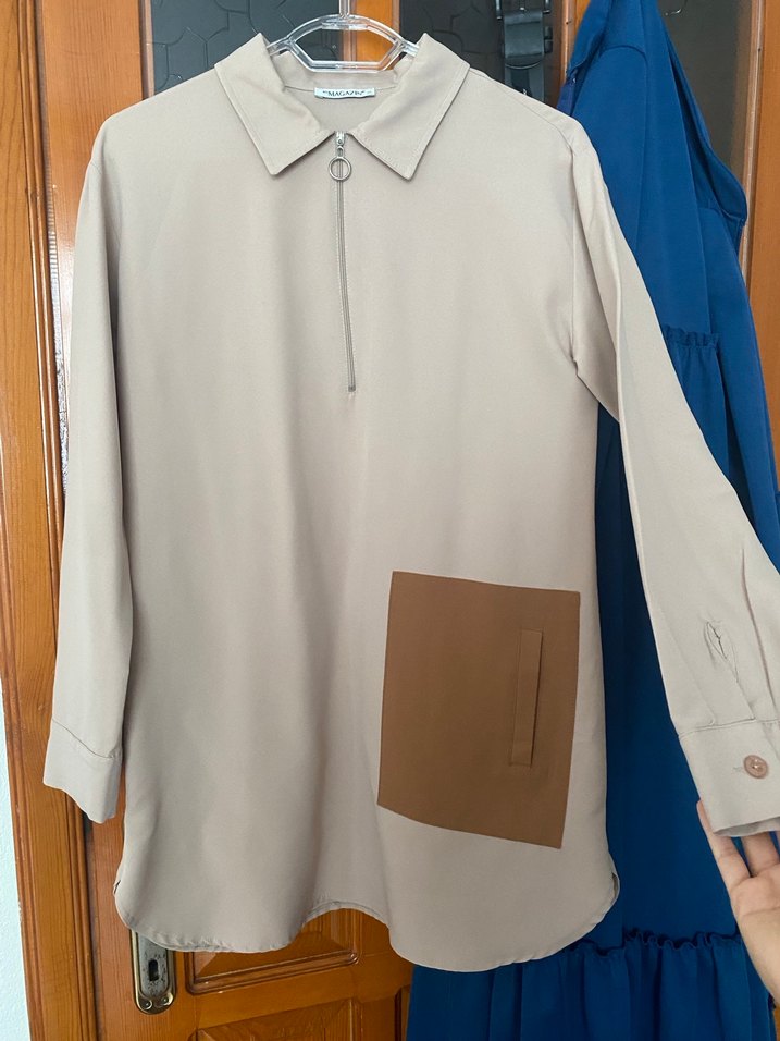 Bej renkte, uzun kollu, yakalı kadın mini tunik. Önde fermuar ve kahverengi cep detayı bulunur. Sentetik kumaştan, gündelik rahat stil için uygundur. Sorunsuz