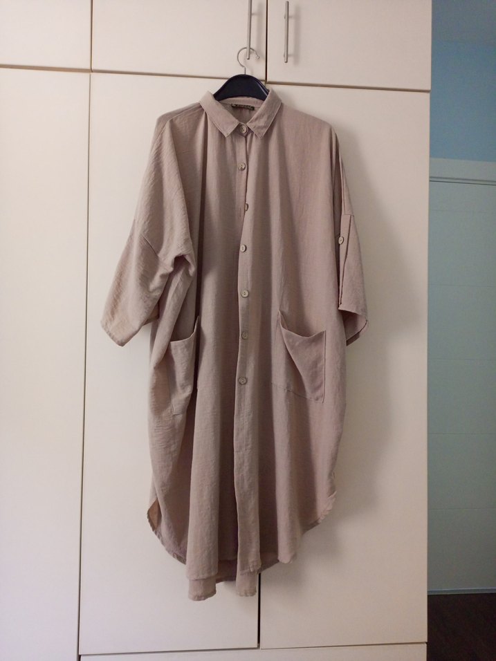 Bej renkte, uzun ve bol kesim, kısa kollu kadın gömlek elbise. Minimalist ve normcore tarzda, desen içermeyen rahat bir model. İki ön cep bulunur. Çok tarz ve çok yönlü kullanılabilinir. iki kol altı uzunluğu 75 cm, boy 110 cm. Sadece iki kez kullandım. ihtiyaç fazlası olduğu için satışa sunuldu.