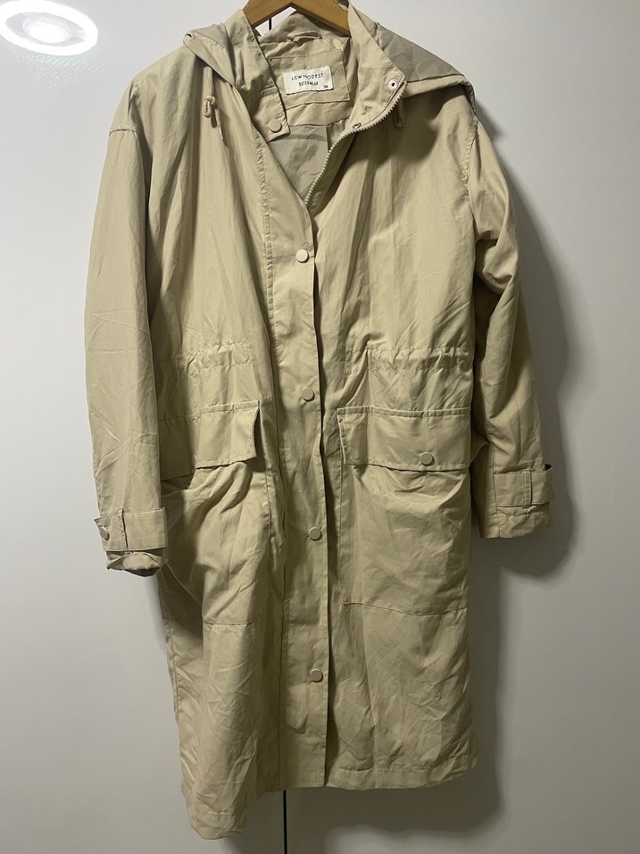 Bej renkli, keten kumaştan uzun boy ve bol kesim kadın yağmurluk. Düğmeli ön, uzun kollu ve klasik yaka detaylarına sahip, sade tasarım.