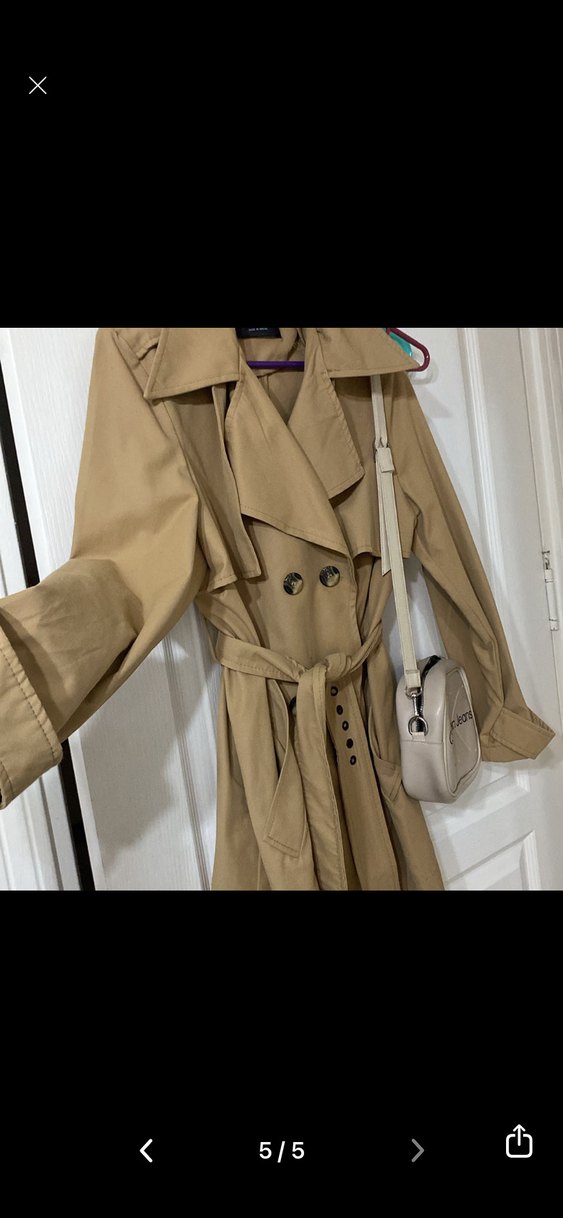 Bej renkli, uzun boy, deri trençkot. Bol kesim, kuşaklı bel ve yakalı. Askılı kollu, desensiz, günlük kullanıma uygun Paris tarzı.
