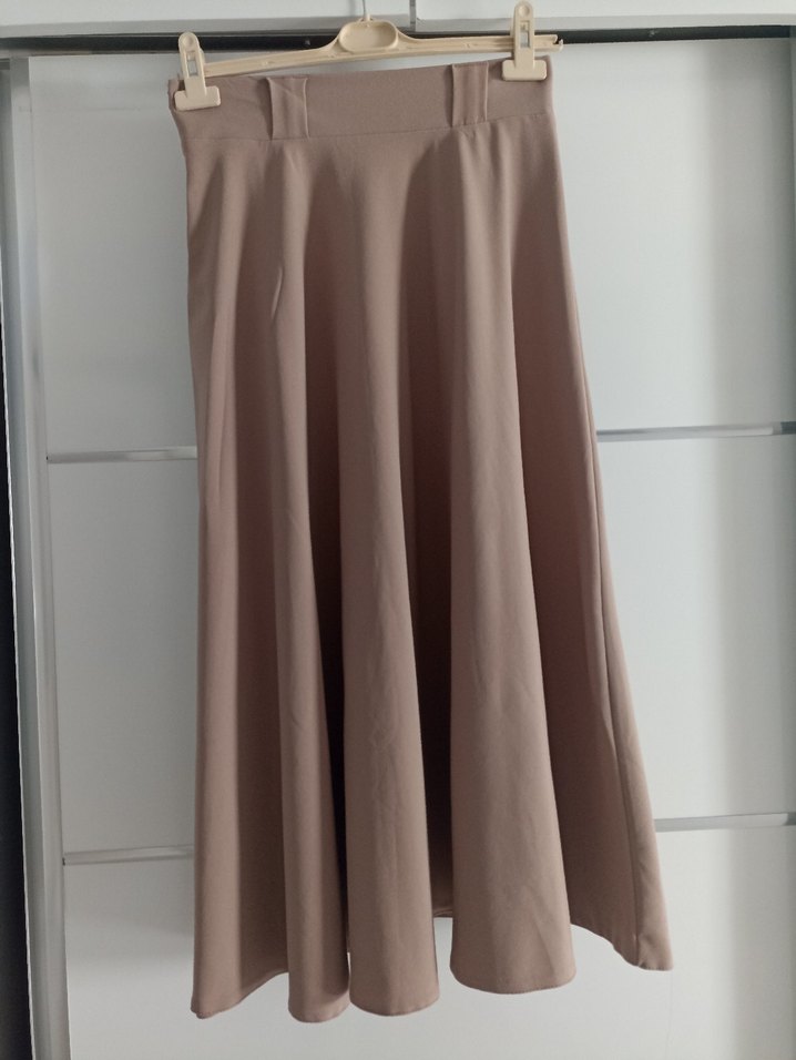 Bej renkli, uzun drapeli tasarıma sahip, sentetik kumaştan yapılmış ve regular fit kesim olan minimalist, çağdaş tarzda günlük kullanıma uygun etek.
