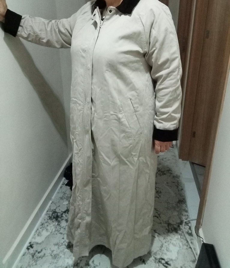 Bej renkte, uzun, düğmeli, notched lapel yakalı, bol kesim, uzun kollu kadın kabanı. Yumuşak sentetik kumaştan, sokak tarzına uygun. 44-46 bedene kadar uyum sağlar.