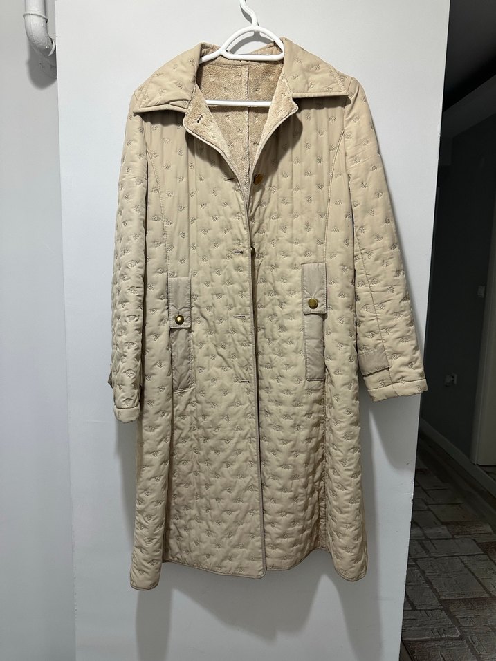 Bej renkli, uzun kesim keten kaban, düğmeli ön kısmı ve uzun kollu yapısıyla günlük kullanıma uygundur. Normal kesim ve keskin yaka detayı bulunur.