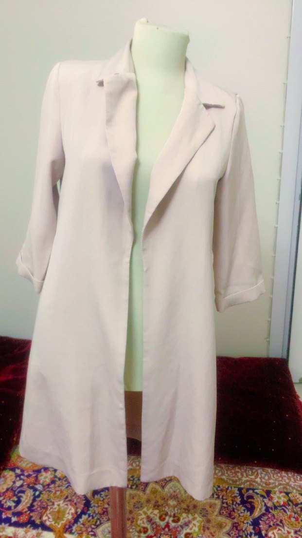 Bej renkli, düğmeli, uzun kollu kadın kabanı. İpek gibi kumaştan, klasik yaka detaylı, ofis için uygun, pastel tonlarda ve modern tarzda.