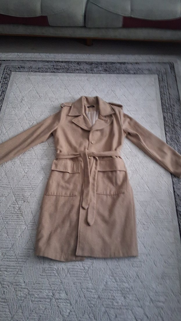 Bej renkte, düğmeli ve kesik yakalı kadın uzun trençkot. Yumuşak ve sıcak kumaştan, regular fit ve uzun kollu, günlük ve sokak stiline uygun.