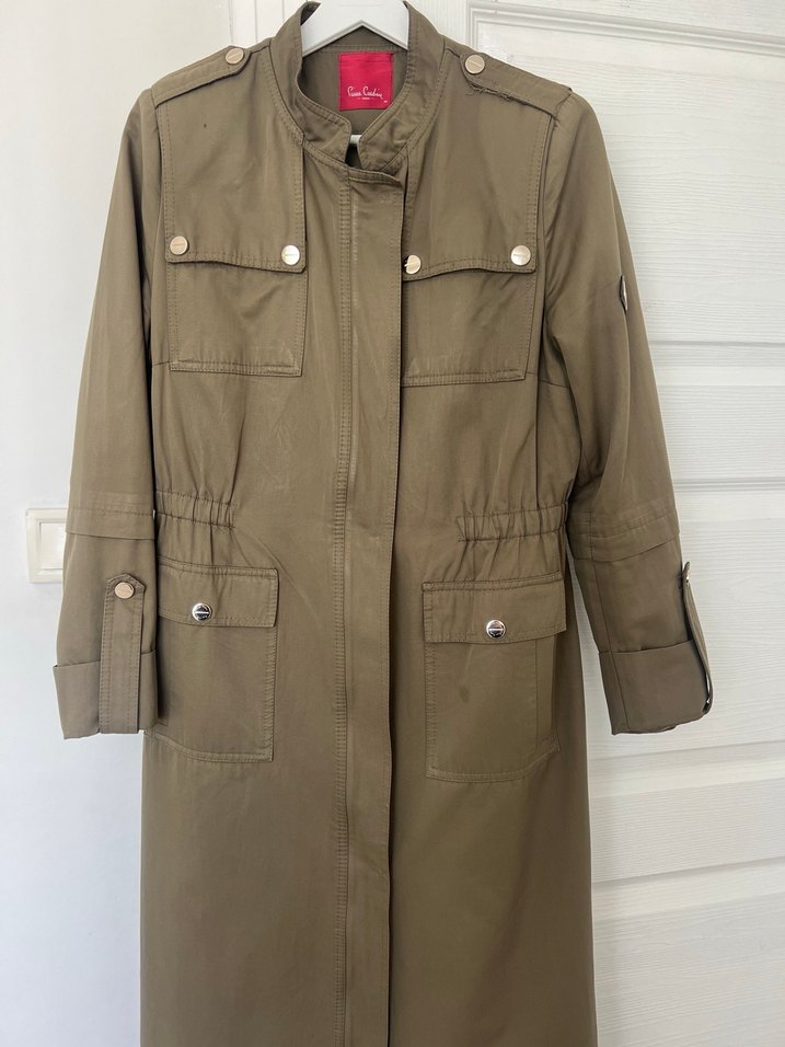 Haki renkli, trençkot. Uzunluğu 120 cm. Spor şık bir ürün. Tertemiz yeni gibi. Herhangi bir deformesi yoktur. Dar kalıp olduğu için 40 beden için 44 beden tercihi edilmiştir. 38-40 beden uyumludur