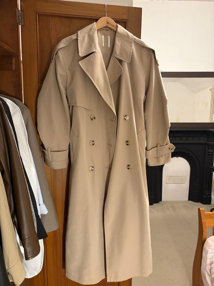 Bej renkli uzun trençkot, düğmeli ve kesimli yakaya sahiptir. Sentetik kumaştan, bol kesim ve uzun kolludur. Günlük kullanıma uygun şık parça.