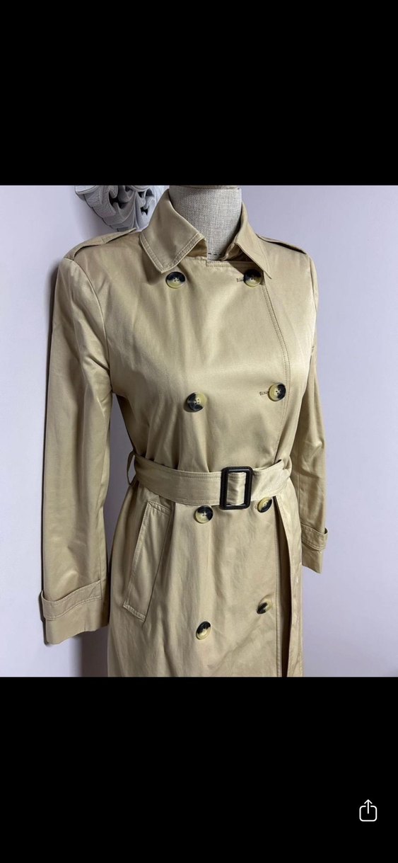 Bej renkli, uzun kadın trençkotu, düğmeli ve kesik yakalıdır. Günlük sokak modasına uygun, rahat kesim ve askılı kolludur.