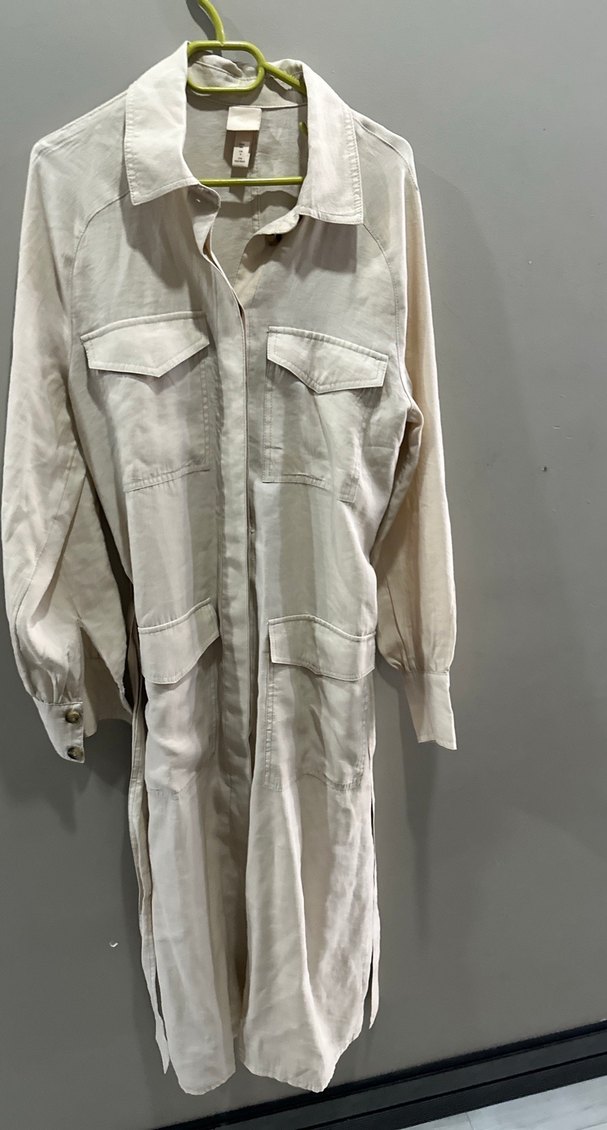 Bej renkli, uzun ve bol kesim kadın elbise. Uzun kollu, düğmeli ve yakası kesimli, günlük sokak stili için uygundur.