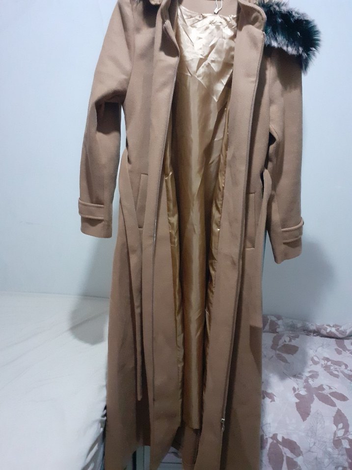 Bej renkte, kapüşonunda kürklü detay bulunan uzun kadın kabanıdır. Sentetik kumaştan yapılmış, regular fit ve uzun kolludur. Günlük kullanım için uygundur.