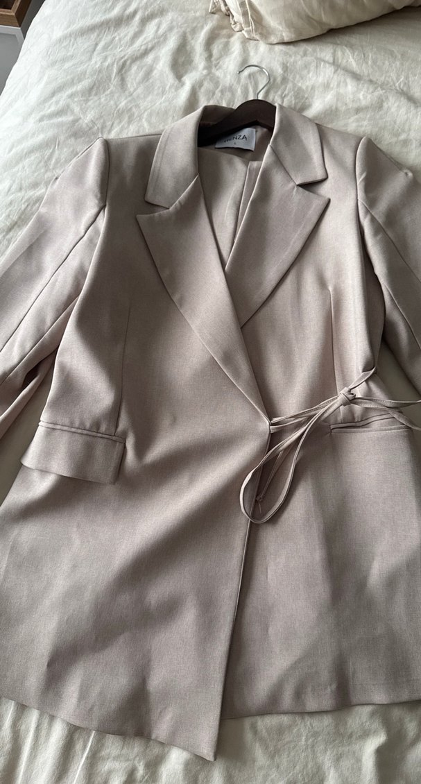 Bej renkli, uzun kemerli kadın blazer ceket. Notched yaka ve askılı kollarla, ipeksi dokuda, ofis kullanımı için uygun.hiç giyilmedi