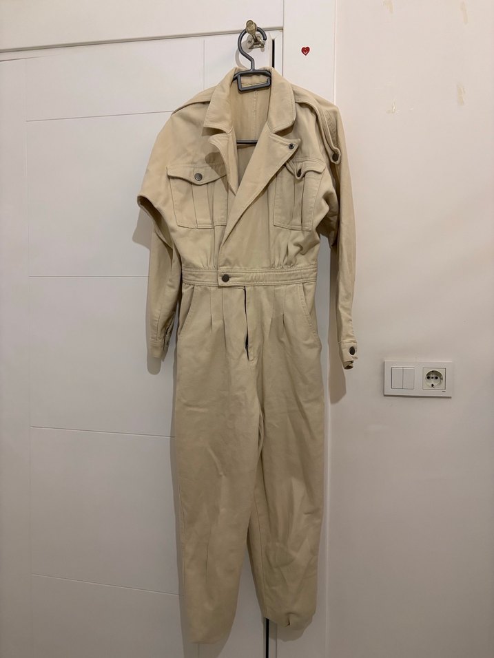 Bej renkli, uzun kollu, kemerli ve keten kumaştan yapılmış uzun tulum. Notlu yaka ve rahat kesime sahiptir.