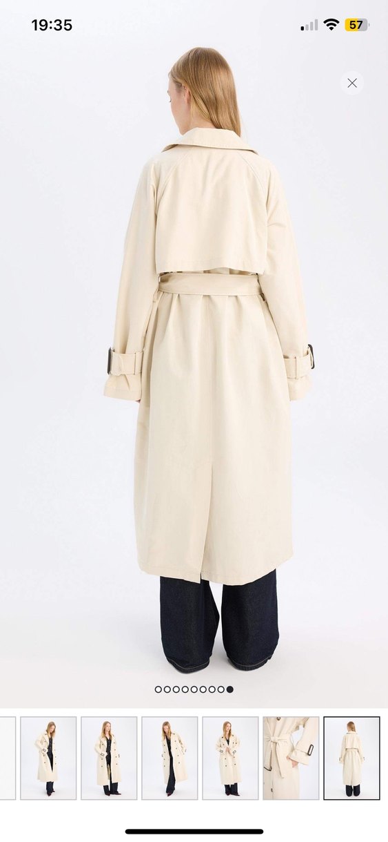 Bej renkli, uzun ve kemerli kadın trençkotu. Pamuklu, bol kesim ve yakalı, desen içermeyen minimalist tasarım. Geçen sene aldım bir defa giydim büyük olduğu için satıyorum bir beden küçüğünü alıcam