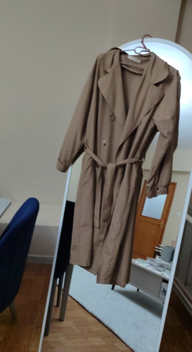 Bej renkli, uzun kesim kadın trençkotu, kemerli ve şal yaka detaylıdır. Rahat kesimi ve uzun kollarıyla minimalist normcore tarzını yansıtır.