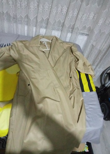 Bej renkli, kemerli, uzun kollu, kesimli ve uzun boylu kadın trençkotu, suni kumaştan, sokak modası tarzında.