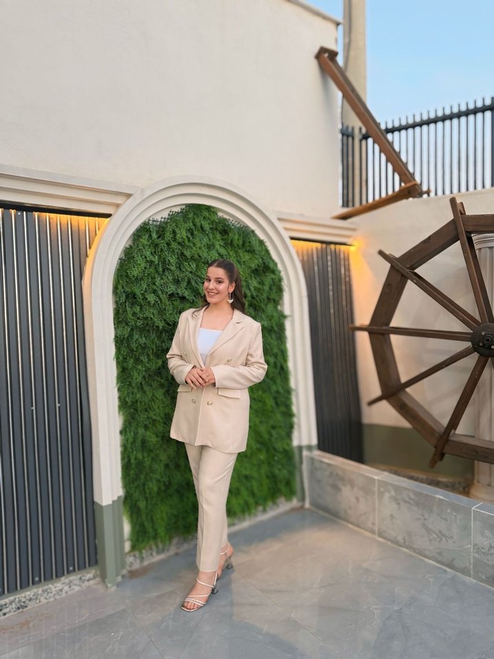 Bej renkli, uzun kesim ve regular fit kadın takım, satenimsi dokuda, yakası kesimli ve askılı kollu. Desensiz tasarımıyla ofis için zarif ve rahat bir şıklık sunar.