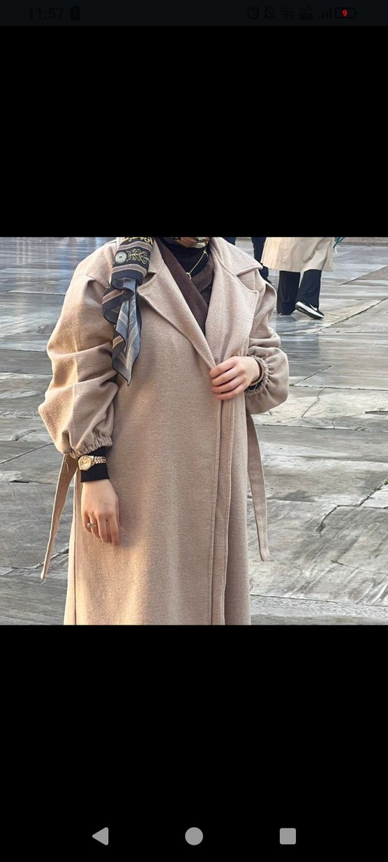Bej renkte uzun kesim kadın kaban, salaş fit ve yaka detayında kesik bulunur. Yumuşak ve sıcak kumaştan, uzun kollu, gündelik sokak tarzına uygun.