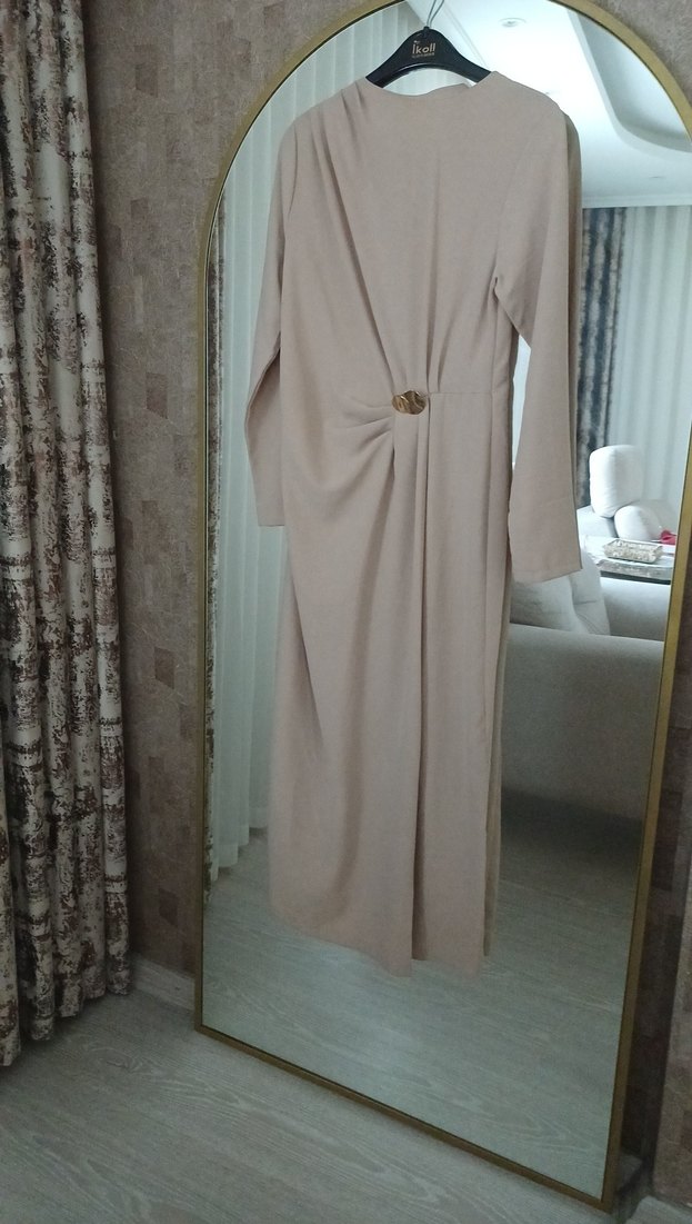 Bej uzun keten elbise, uzun kollu ve kesimli yakaya sahip. Drapeli tasarımı ve rahat kesimiyle modern klasik ofis şıklığı sunar.
