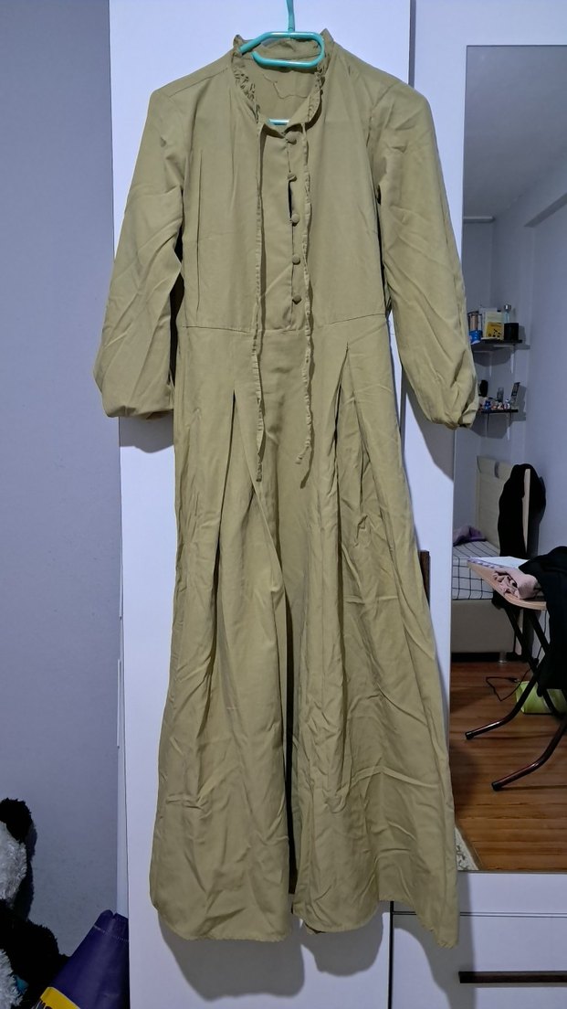 Bej renkli, keten kumaştan uzun ve bol kesim elbise, düğmeli ve yakası notched lapel. Günlük kullanıma uygun bohem vintage tarzı.