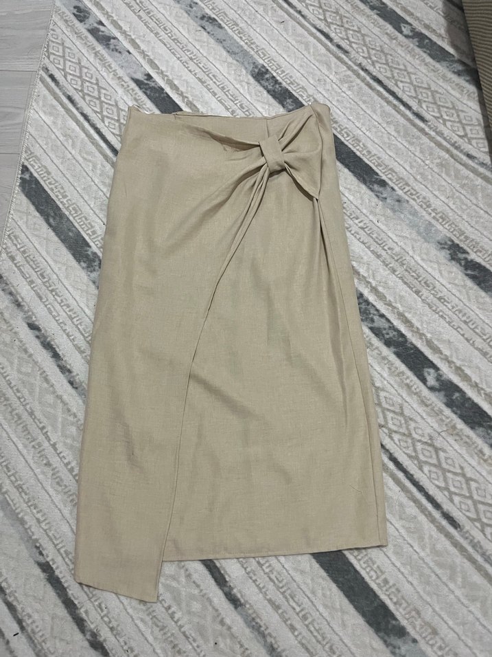 Bej renkte, keten kumaştan uzun ve drapeli kadın eteği. Günlük kullanıma uygun, rahat ve minimalist tarzda.