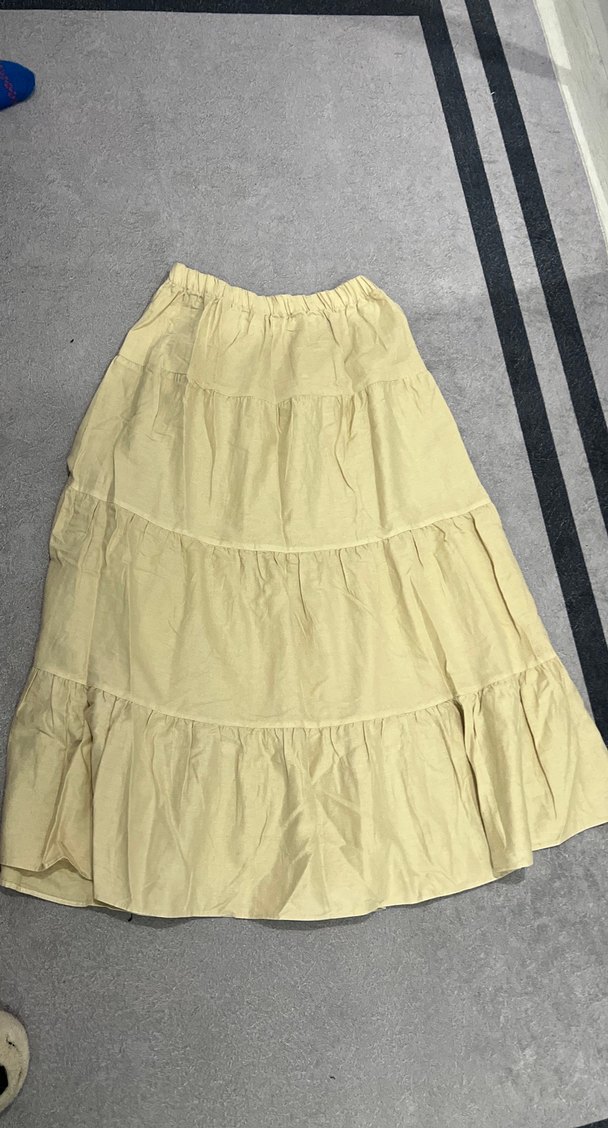 Bej renkte, keten kumaştan uzun ve bol kesim etek. Volan detaylarıyla bohem tarzı yansıtıyor.