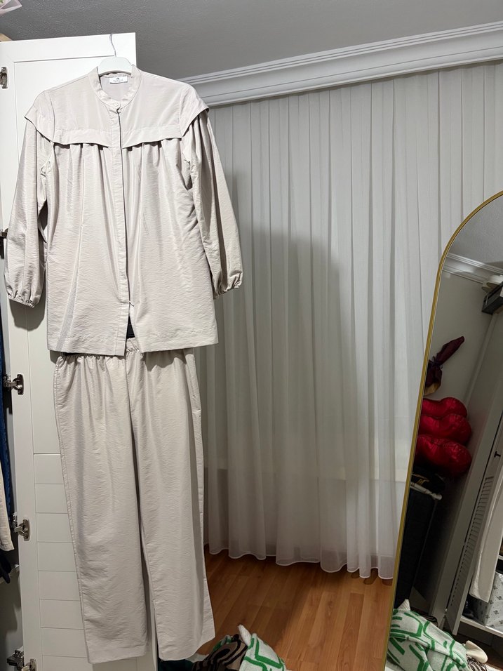 Bej renkte, keten kumaştan, bol kesim ve uzun boy kadın takımı. Uzun kollu ve yüksek yakalı, minimalist ve zahmetsiz şıklık sunar.
