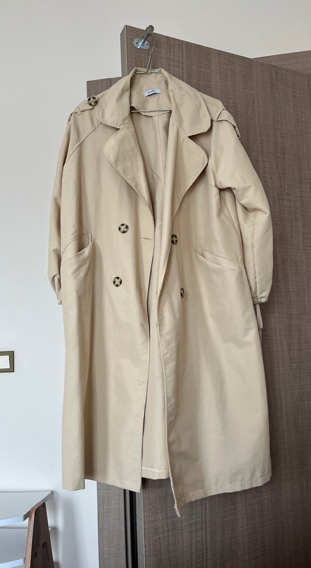 Bej renkli keten kumaştan yapılmış, düğmeli ve uzun kollu, uzun boylu, gevşek kesim trençkot. Paris sokak stili için uygun. Sadece önünde ufak lekesi var onun dışında bi sorunu yok giymediğim için satıyorum bedeni L uzunluk 105 cm iki koltuk arası 57 cm