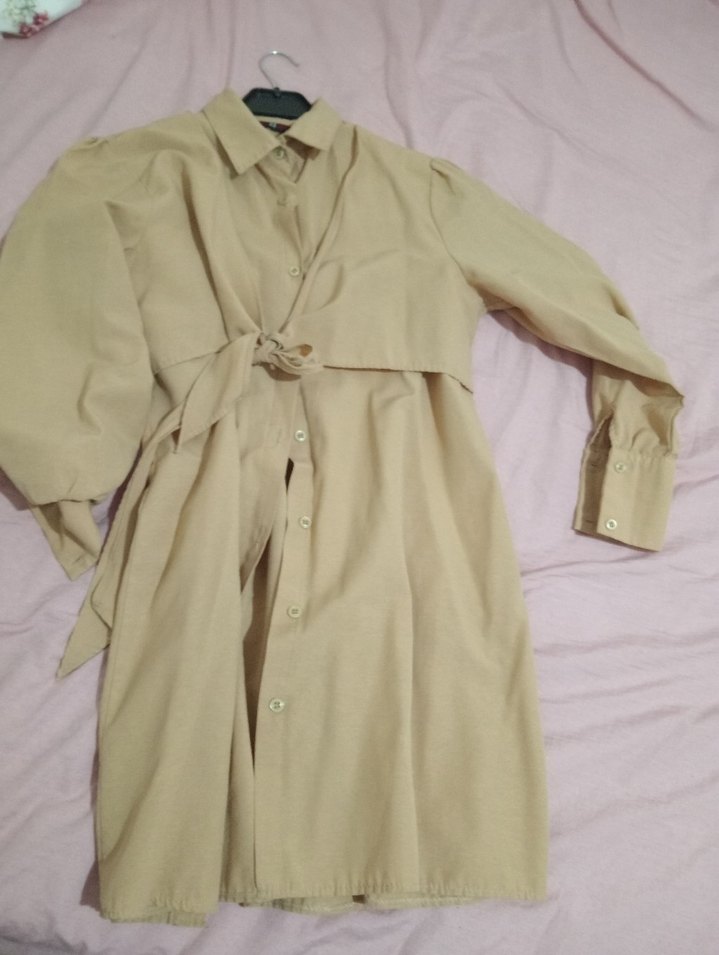 Bej renkli uzun keten trençkot, düğmeli ön ve yakalıdır. Bol kesim, uzun kollu ve belde bağcık detayına sahiptir. Paris sokak stiline uygun rahat bir parça.