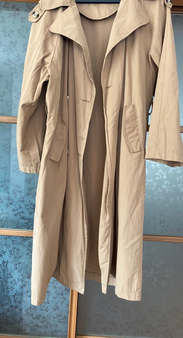 Bej renkte, keten kumaştan, uzun ve bol kesimli, yakası çentikli, drapeli kadın trençkotu.