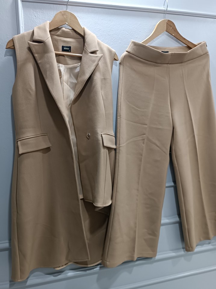 Bej renkte, yakalı ve düğmeli, sentetik kumaştan uzun kollarsız kadın takımı. Ofis için uygun, rahat kesimli ve trend sokak stiliyle uyumlu.