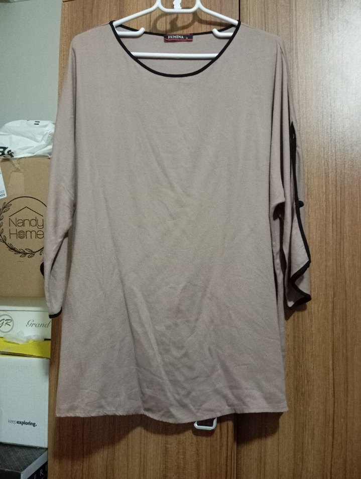 Bej renkli, uzun kollu yuvarlak yakalı ve bol kesim. Günlük kullanıma uygun rahat ve şık bir parça.