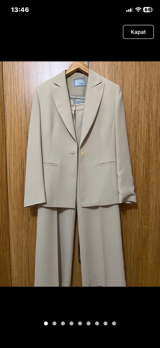 Bej renkte, düğmeli, uzun kollu ve ipeksi dokulu kadın takımı, modern klasik tarzda ve ofis kullanımı için uygundur. Kalıbı dar S beden uyumludur
