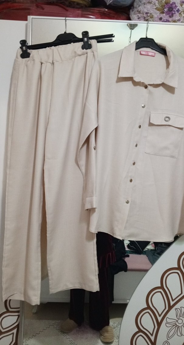 Bej renkte, uzun kollu ve düğmeli ceket ile uyumlu uzun paça pantolondan oluşan rahat kesim kadın takımı. Yumuşak keten kumaştan üretilmiştir.